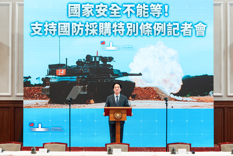賴清德總統今(11)日上午主持「國家安全不能等!支持國防採購特別條例」記者會,針對行政院所提「國防特別預算條例」草案迄今未能在立法院付委審查,向國人說明政府對國軍待遇的重視及推動國防特別預算的急迫性,並籲請朝野政黨儘速完成審議,共同守護國家安全與區域和平。