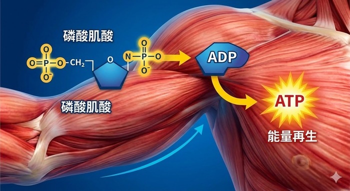要理解肌酸的作用,首先必須了解人體的能量系統。當肌肉收縮時,細胞會消耗ATP(三磷酸腺苷)作為能量來源。ATP可以被視為人體的即時能量貨幣。然而肌肉中儲存的ATP其實非常有限,在高強度運動中通常只能維持2至3秒。當ATP快速消耗後,身體會啟動ATP–PC能量系統(ATP–Phosphocreatine System)。在這個系統中,磷酸肌酸會將磷酸基轉移給ADP,使其重新生成ATP。換句話說,肌酸的作用就是幫助ATP更快再生。因此肌酸最有用的運動情境通常是短時間、高強度且需要爆發力的活動,例如舉重、短跑、籃球、足球、橄欖球與CrossFit等運動。