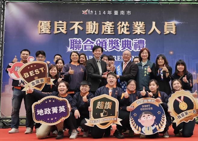 為肯定長期深耕不動產專業、落實交易安全並守護市民權益的從業人員,臺南市政府地政局於114年12月26日在永華市政中心舉辦「114年優良不動產從業人員聯合頒獎典禮」,公開表揚表現卓越的地政士、不動產經紀人員、不動產估價師及租賃住宅服務業者,展現臺南市推動不動產專業治理與交易安全的具體成果。