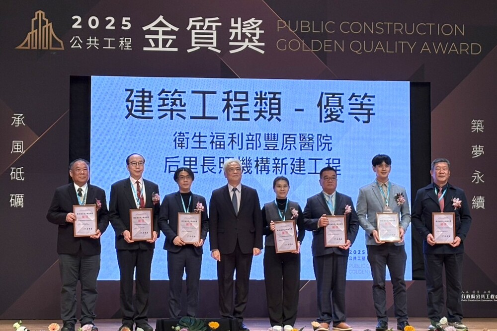 在建築工程類方面,本署獲獎的是位於臺中的「衛生福利部豐原醫院后里長照機構」新建工程。該建築以長照住民使用需求為設計核心,融合永續及智慧科技概念,取得綠建築銀級標章、建築能效一級及智慧建築合格認證,整合住宿式長照、日間照顧及醫療支援服務,提供北臺中及鄰近苗栗卓蘭、三義、銅鑼等地區居民完善的醫療與長照服務。
