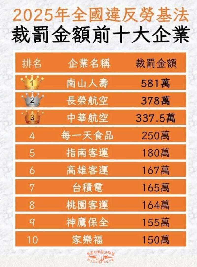 根據勞團整理的勞動部「違反勞動法令事業單位查詢系統」資料統計,2025年全年度裁罰金額前十大違法雇主如下:南山人壽(581萬元)、長榮航空(378萬元)、中華航空(337.5萬元)、每一天調理食品(250萬元)、指南客運(180萬元)、高雄客運(167萬元)、台積電(165萬元)、桃園客運(164萬元)、神鷹保全(155萬元)以及家樂福(150萬元)。