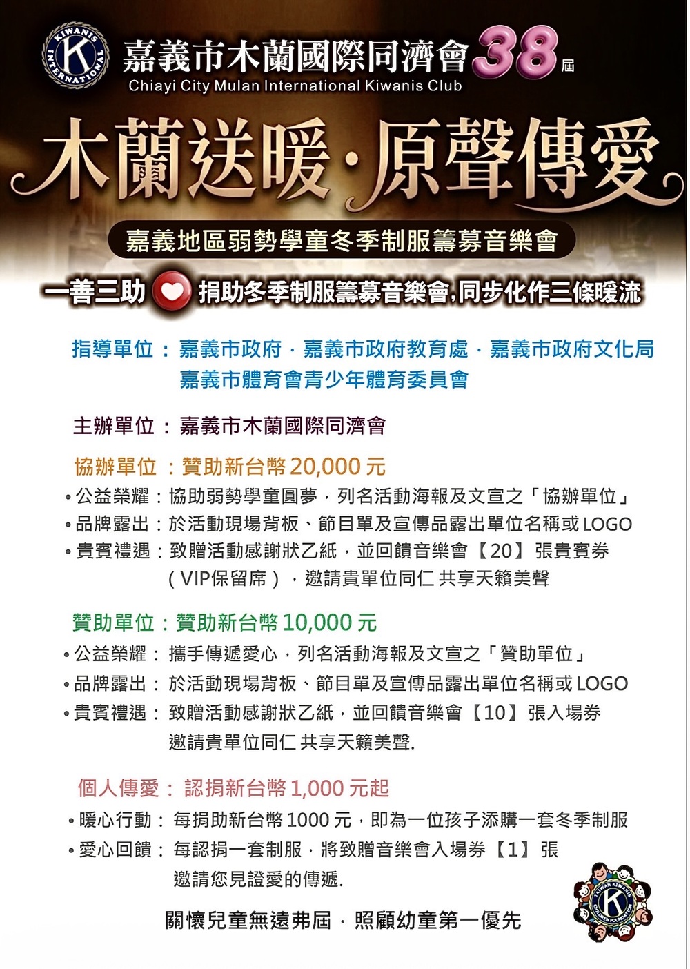 主辦單位表示,活動由嘉義市木蘭國際同濟會主辦,並獲嘉義市政府、嘉義市政府教育處、嘉義市政府文化局及嘉義市體育會青少年體育委員會指導支持。此次募款方案分為協辦單位、贊助單位及個人傳愛等多元參與方式,提供企業與民眾不同層級的公益響應選項,包括品牌露出、感謝狀及音樂會入場票等回饋。