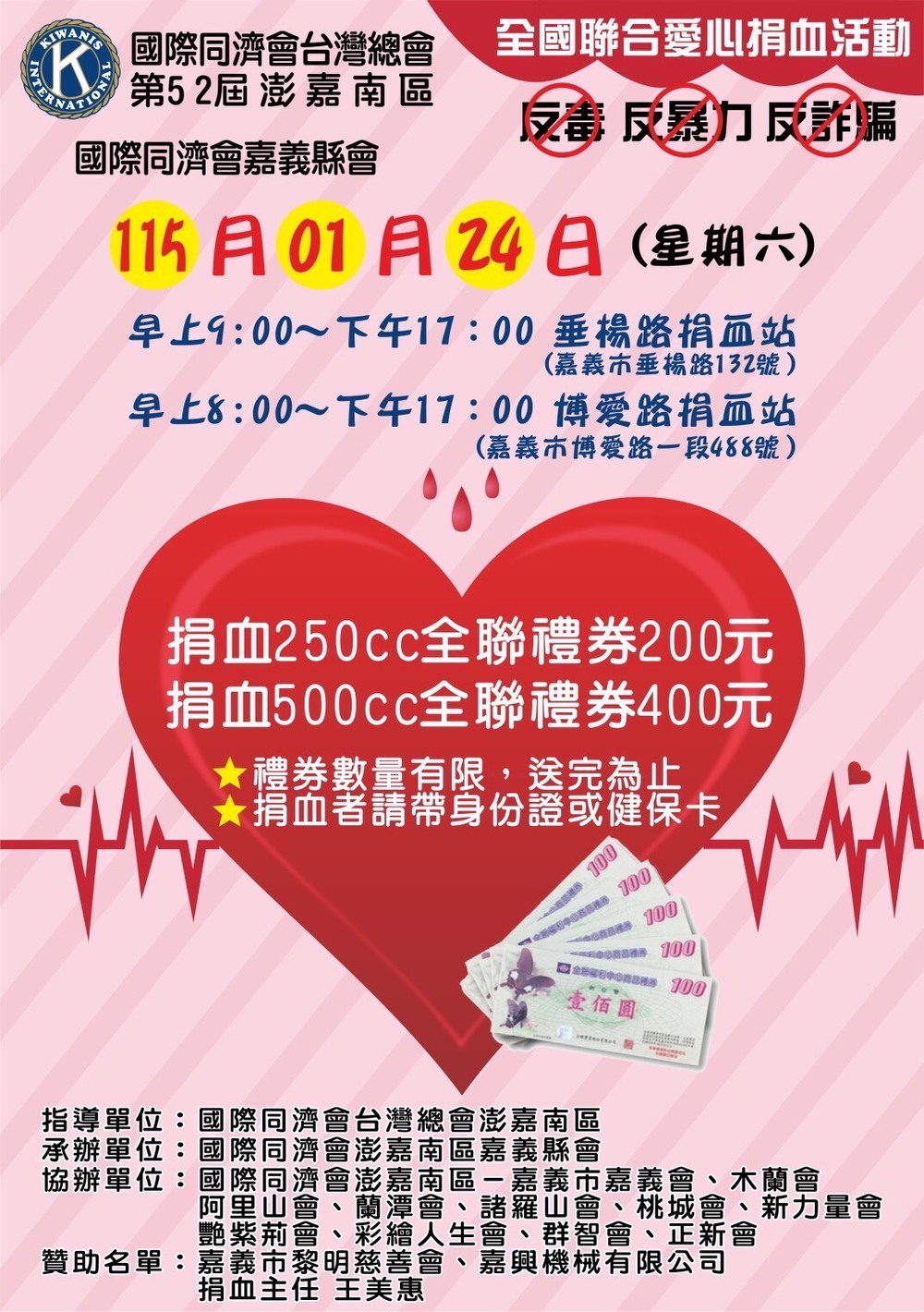 此外,活動也獲得嘉義市黎明慈善會、嘉興機械有限公司等單位贊助支持,並由捐血主任王美惠統籌協調。