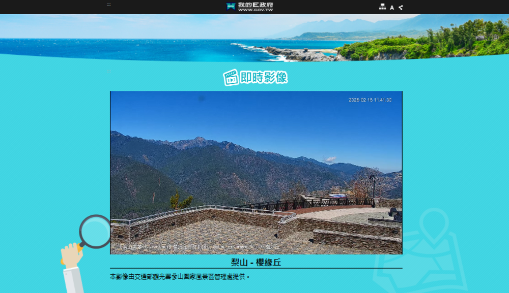 數位發展部表示,「我的E政府」打破地理限制,提供北起基隆和平島、南至屏東舊排灣部落,甚至涵蓋馬祖、綠島等離島港口的即時景點影像導覽(網址:https://www.gov.tw/taiwan)。民眾出發前可透過手機確認天氣是否晴朗、觀察景點人潮飽和度,精準安排造訪時機,有效提升春節旅遊舒適度。
