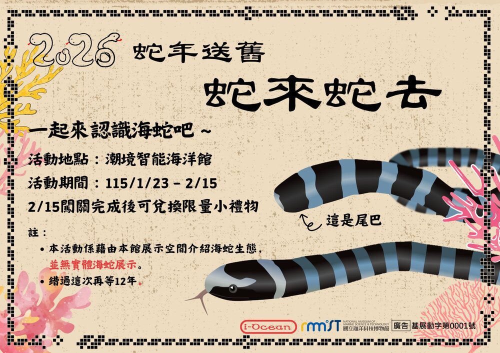 國立海洋科技博物館春節期間(初二至初五)推出人氣吉祥物「北火熊」現身發放限量紅包,並舉辦「馬上有錢」皮革DIY活動,象徵新春好運到。另於初四至初六推出「風水輪轉・好運啟航」活動,民眾可操控遙控水槳船完成「8字形」航線,寓意順風順水、好運循環。此外,115年館方持續提供年度優惠,包括當月壽星全區免費入館,以及兒童清明連續假期12歲以下免費入館等方案。