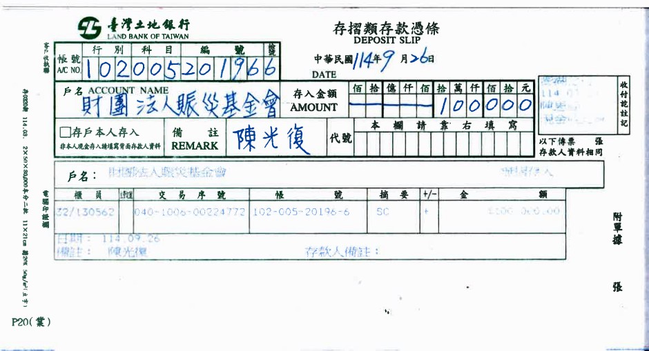 澎湖縣長陳光復第一時間以個人名義捐款新臺幣10萬元,表達對光復鄉鄉親的關心。陳光復表示,身處離島,能深切體會災後孤立無援的感受,「我們不能缺席,也不會缺席」,希望藉由民間善舉,凝聚更多社會力量投入賑災。