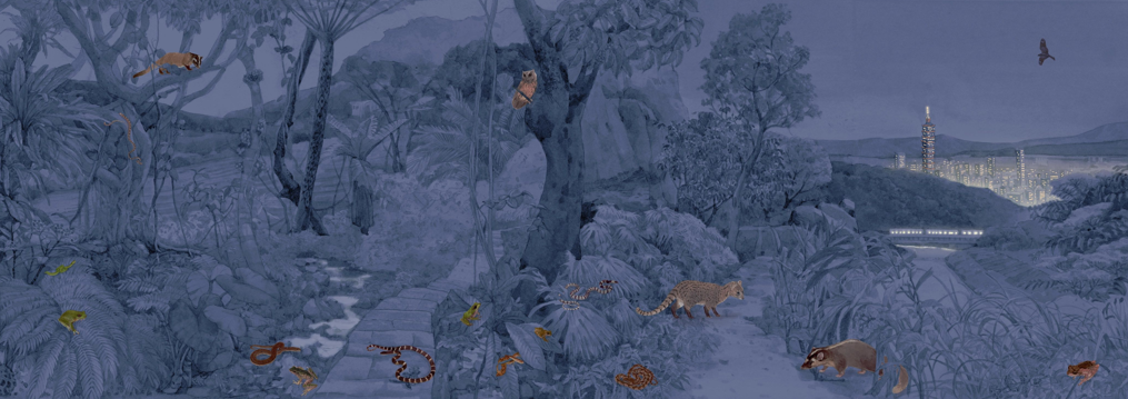 大地處說明,這張摺頁以水彩風手繪呈現,透過細膩筆觸描繪淺山日夜交替的生態樣貌。白天時分,大鳳蝶與鑽灰蝶穿梭林間,大冠鷲盤旋天際,展現活躍的日行性生命力;夜幕降臨後,領角鴞低鳴迴盪,斯文豪氏赤蛙與臺北樹蛙接續登場,讓同一片山林在夜晚展現截然不同的生命節奏。摺頁正反兩面分別呈現白天與黑夜,巧妙詮釋同一環境中截然不同、卻同樣精彩的生態故事。