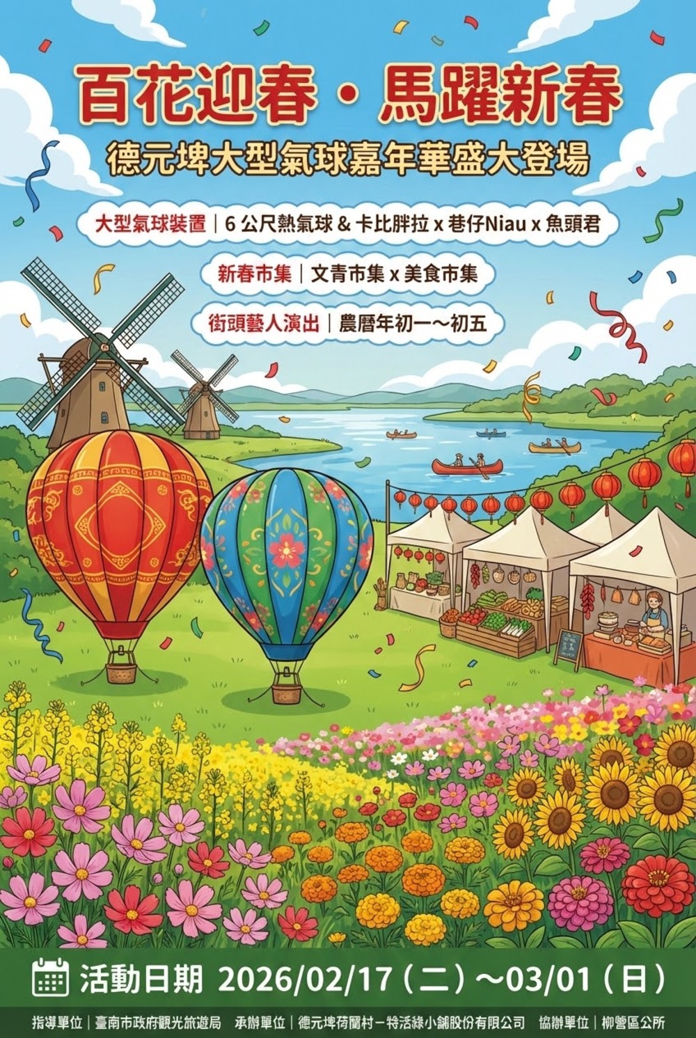 為迎接新春佳節,德元埤荷蘭村將於2月17日至3月1日舉辦「百花迎春・馬躍新春 德元埤大型氣球嘉年華」,2月15日至16日則為園區休園日。本次活動以大型氣球藝術裝置為主軸,結合人氣角色、百花花海景觀及主題化露營體驗,打造春節期間兼具視覺亮點、親子互動及療癒氛圍的節慶型園區活動,邀請民眾走春踏青,感受德元埤獨有的新年魅力。