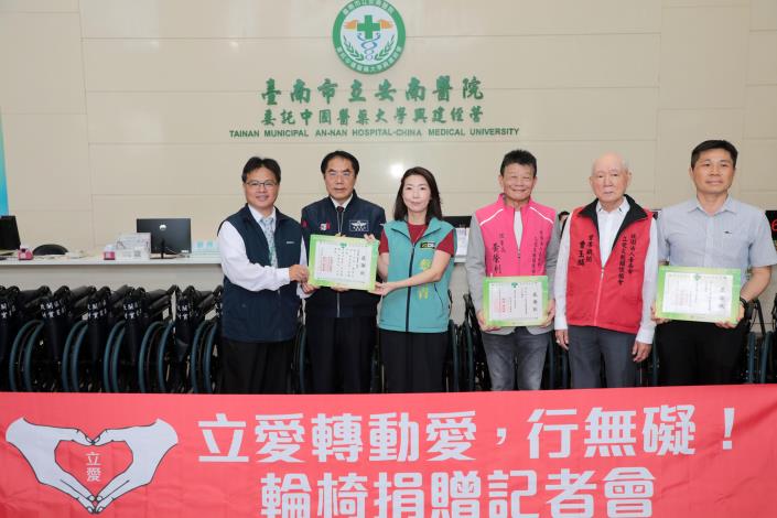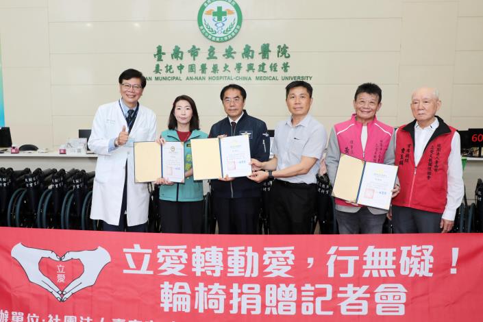 為提升醫療院所服務效能並照顧行動不便民眾就醫需求,立愛文教關懷協會攜手國產建材實業集團,捐贈130張輪椅予臺南市4家急救責任醫院,18日上午於安南醫院醫療大樓1樓大廳舉行捐贈儀式。臺南市長黃偉哲親自出席見證並頒發感謝狀,肯定民間團體長期投入公益,攜手市府打造更友善的醫療環境。
