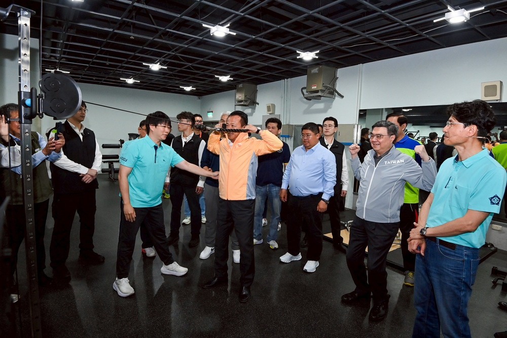 卓榮泰在中正大學體育中心主任廖俊儒說明下,了解場館營運及配套措施,並肯定校方積極響應國家政策、開放資源與社區共享。隨後,他在擔任運動教練的助理教授張博涵帶領下,體驗啞鈴肩推、下肢重量訓練及肩關節伸展運動等課程,實際感受規律訓練對健康促進的重要性。