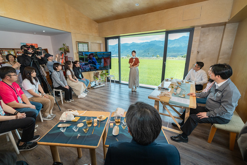 賴總統抵達後,首先參與品茗體驗,並聆聽「女兒不懂茶」創辦人林廷瑀分享地方創生成果。林廷瑀的父親林潮意曾於28歲獲得「神農獎」,後因茶園作為國道三號公路用地被徵收,遷居臺東鹿野深耕製茶工藝40年。賴總統表示,透過林廷瑀的分享,不僅展現茶葉品質與製作工藝,更將茶轉化為生活體驗與文化表現,成功帶動鹿野及臺東茶產業從第一級農業邁向第六級產業。