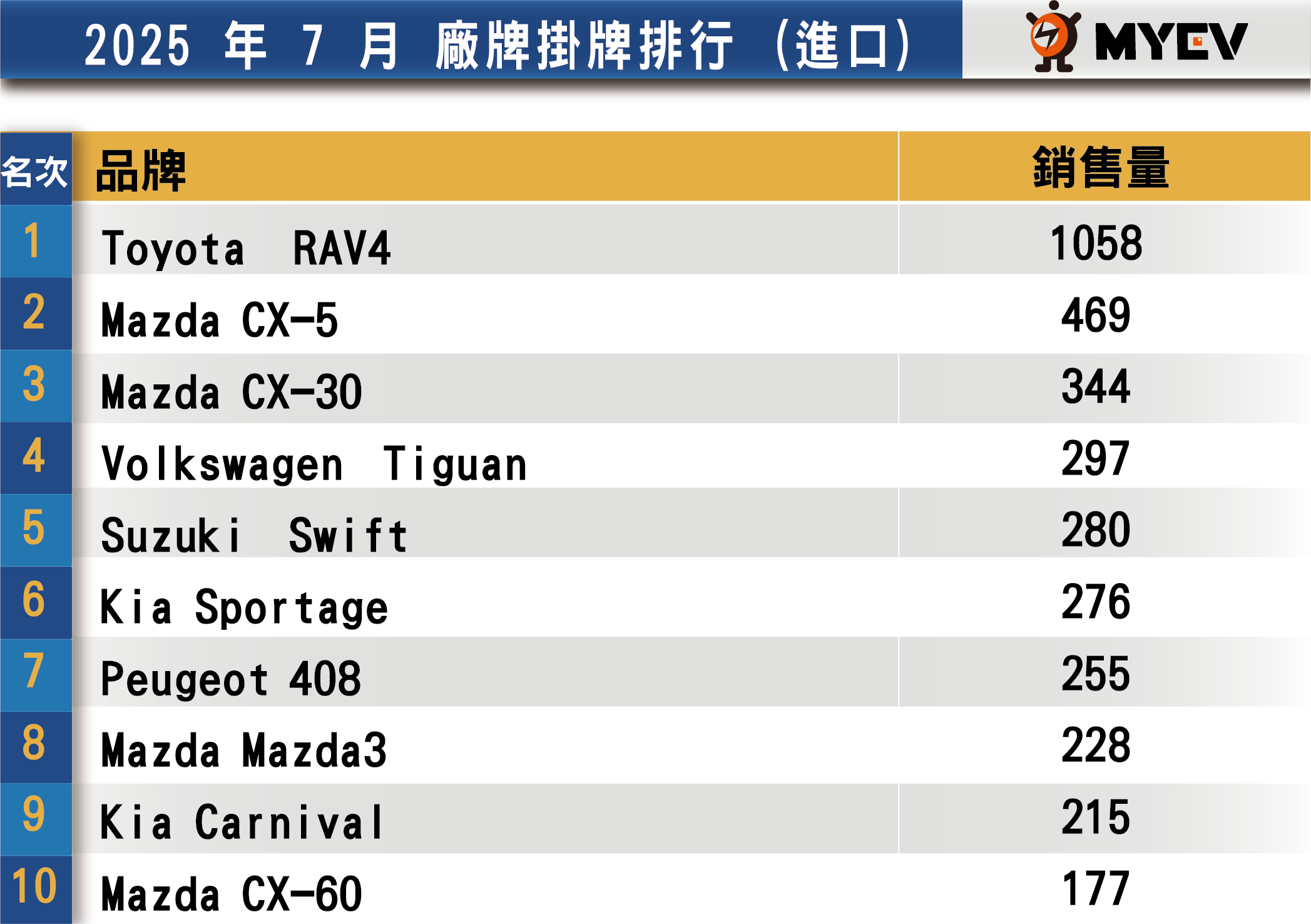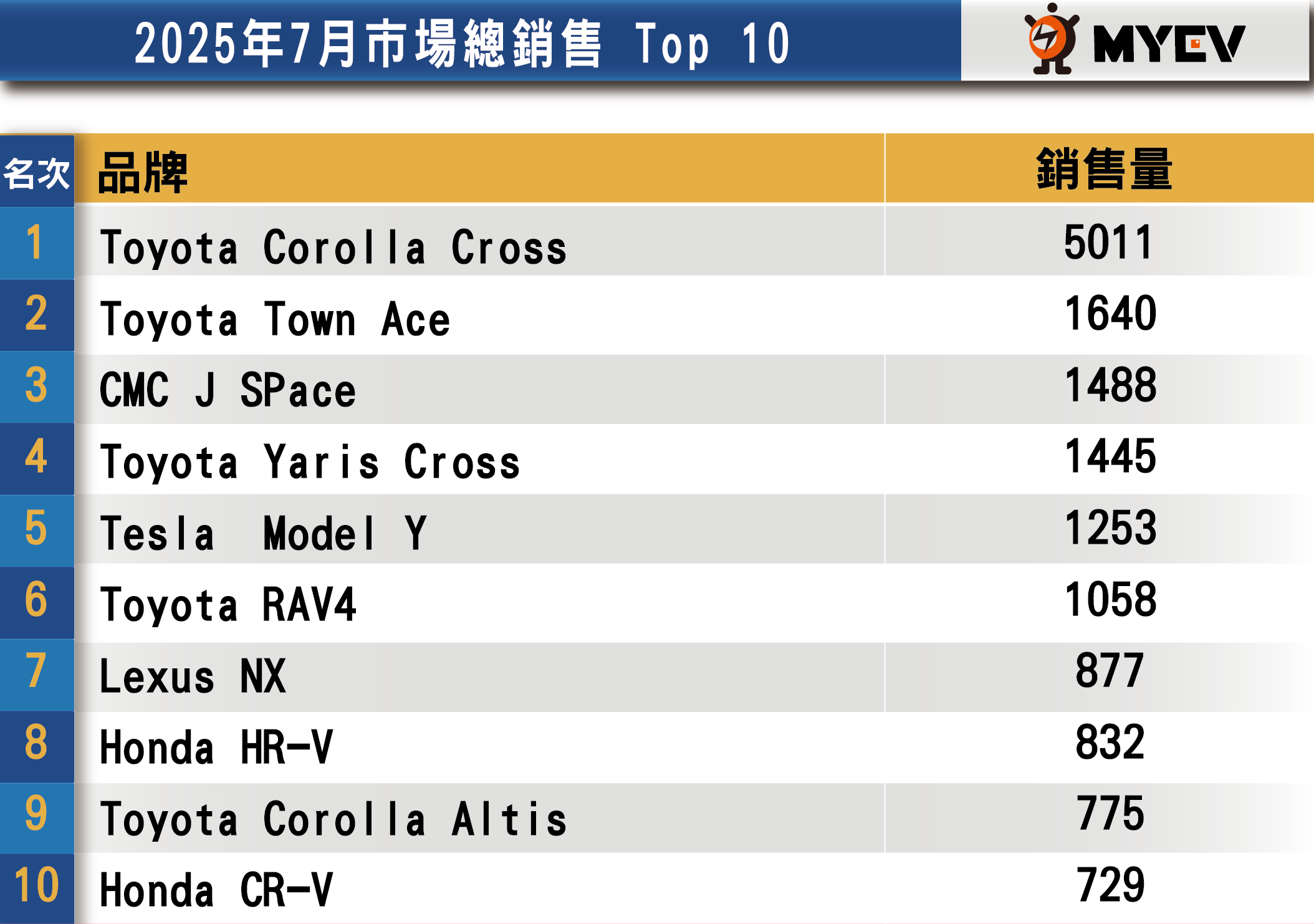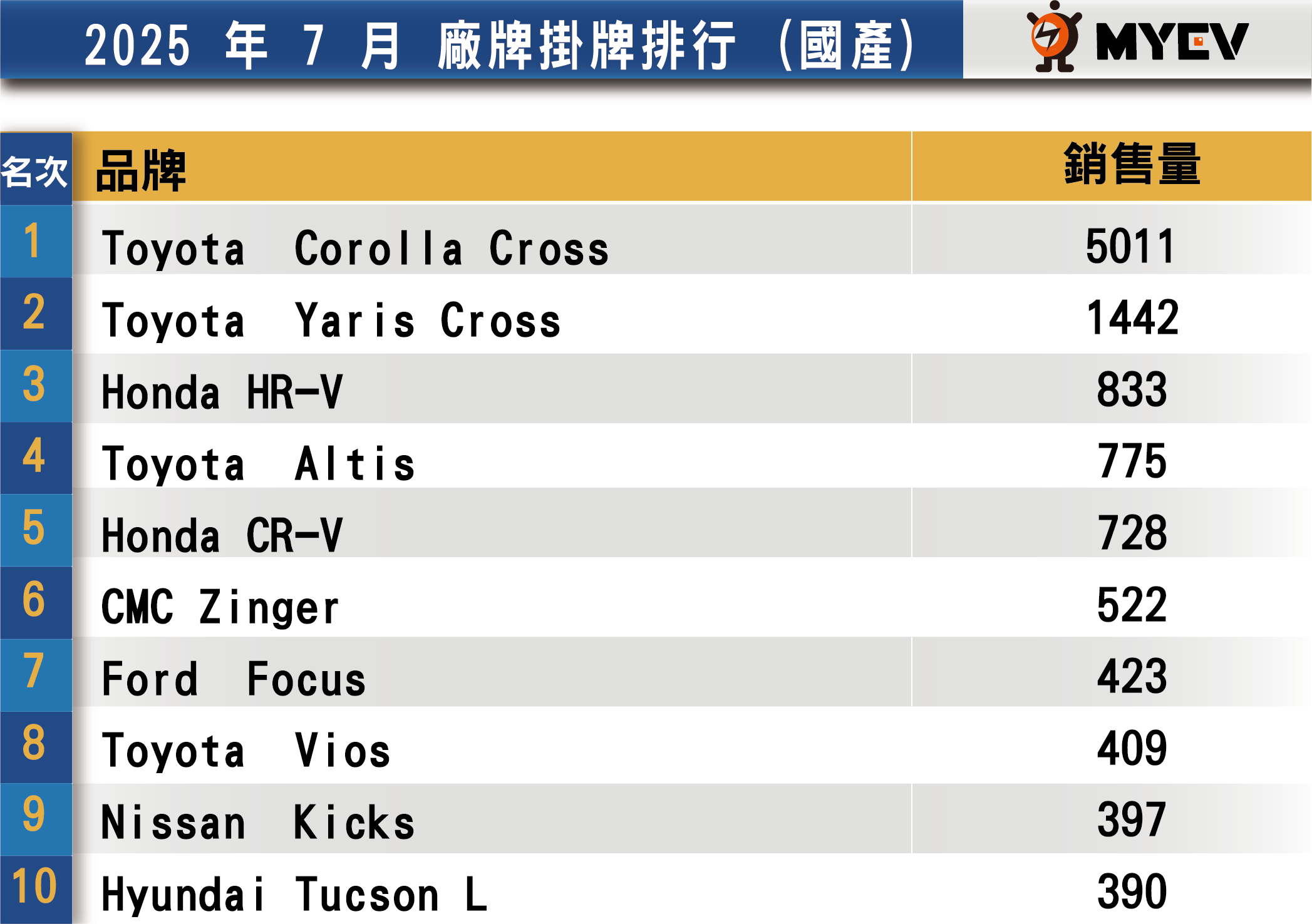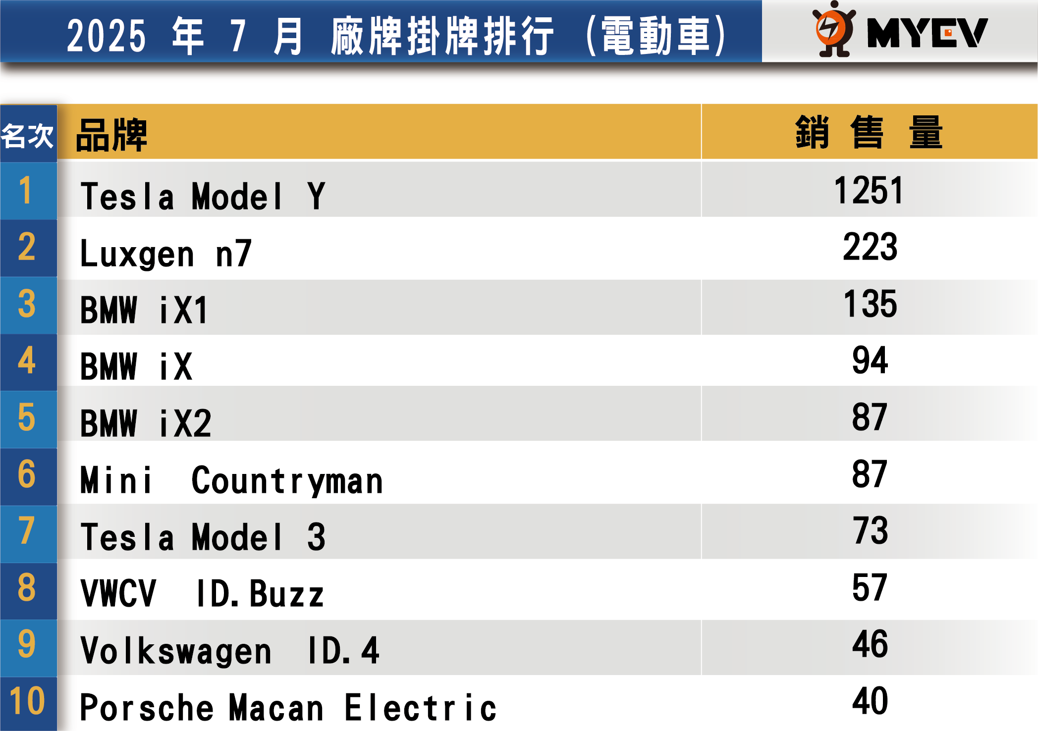 另一方面,Tesla旗下Model Y受惠於新車熱度與電動車話題加持,單月繳出1,253輛成績,不僅勇奪豪華品牌掛牌冠軍,更擠入全體市場Top 5排行,成為本月車市亮點之一。