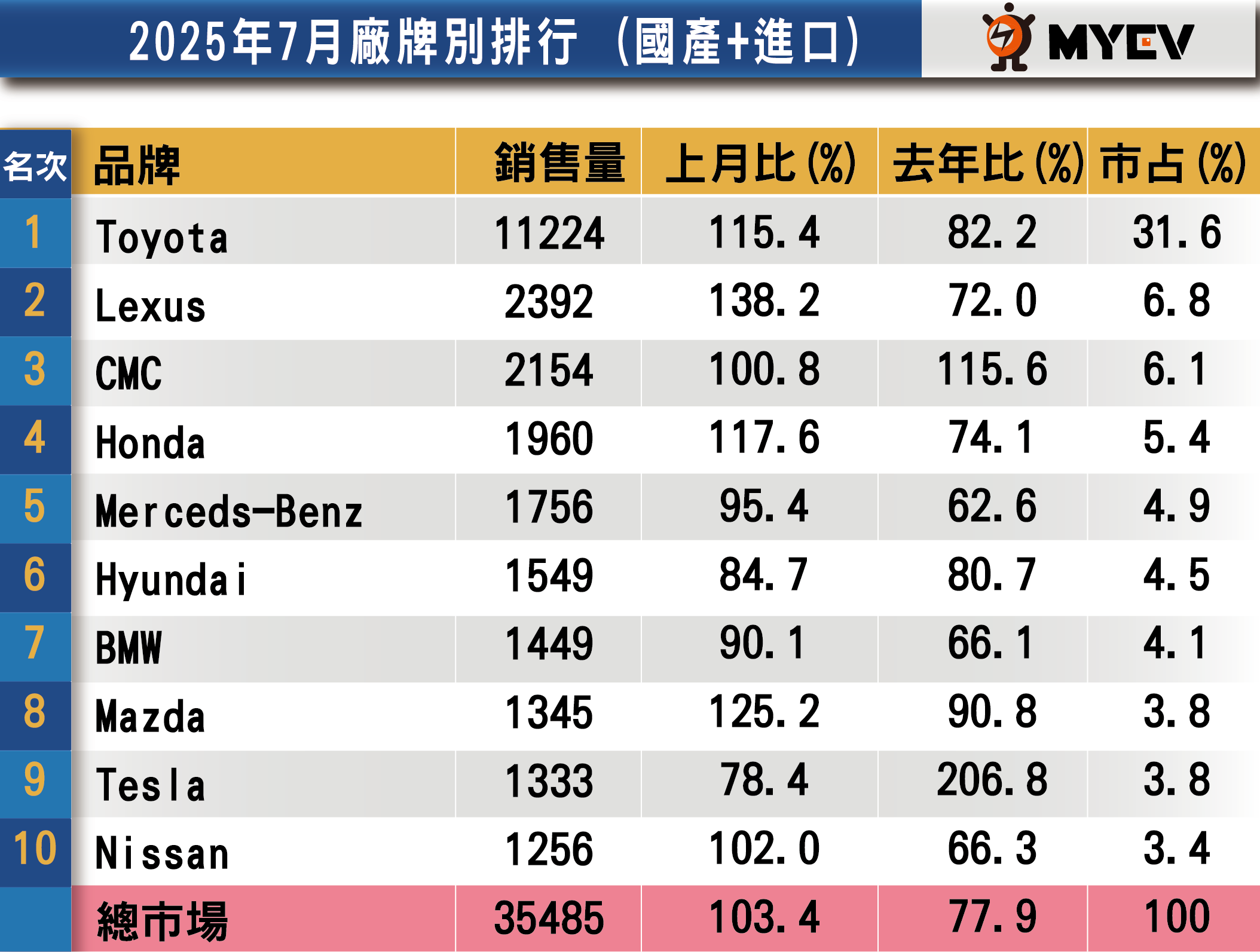 儘管市場高度關注美國針對台灣商品的關稅政策調整,白宮日前揭示對台暫時性關稅為20%,但台灣汽車市場在2025年7月仍未見顯著回溫。根據最新掛牌數據顯示,7月全台新車掛牌數為35,483輛,較6月小幅上升3.4%,卻較去年同期大幅衰退22.3%,顯示整體消費信心仍未恢復,主因與關稅、貨物稅未調整等政策性因素密切相關。