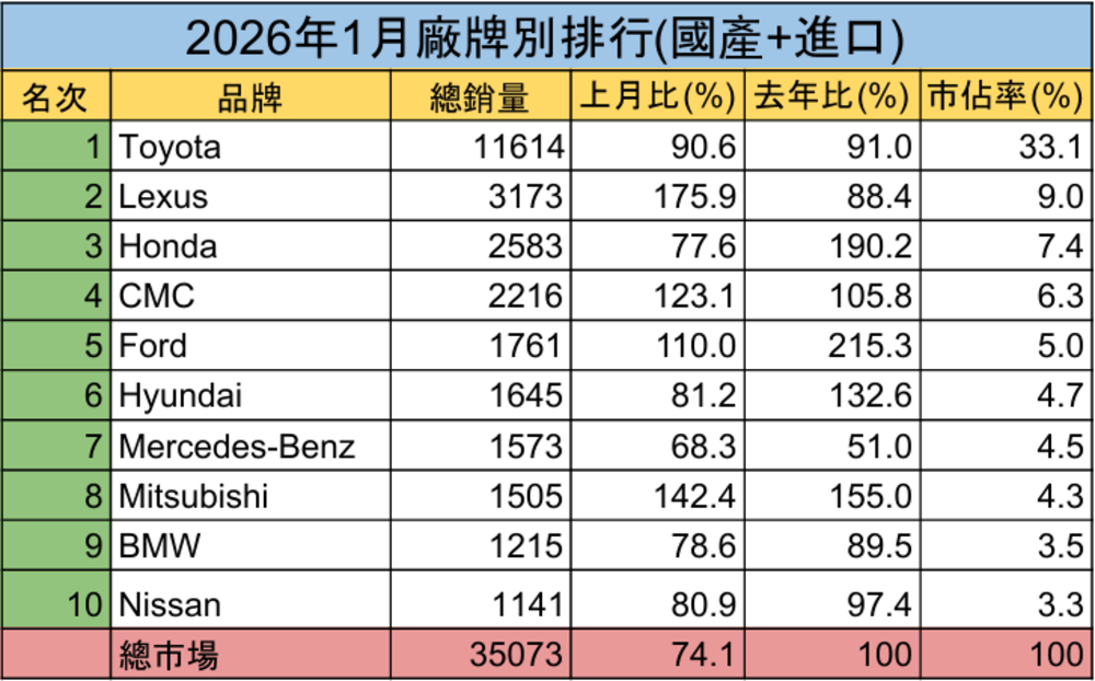 整體而言,2026年1月車市表現屬於年底高峰過後的自然修正,而非需求急凍。國產車持續支撐基本盤,進口車與電動車則受交車節奏影響出現短期波動。