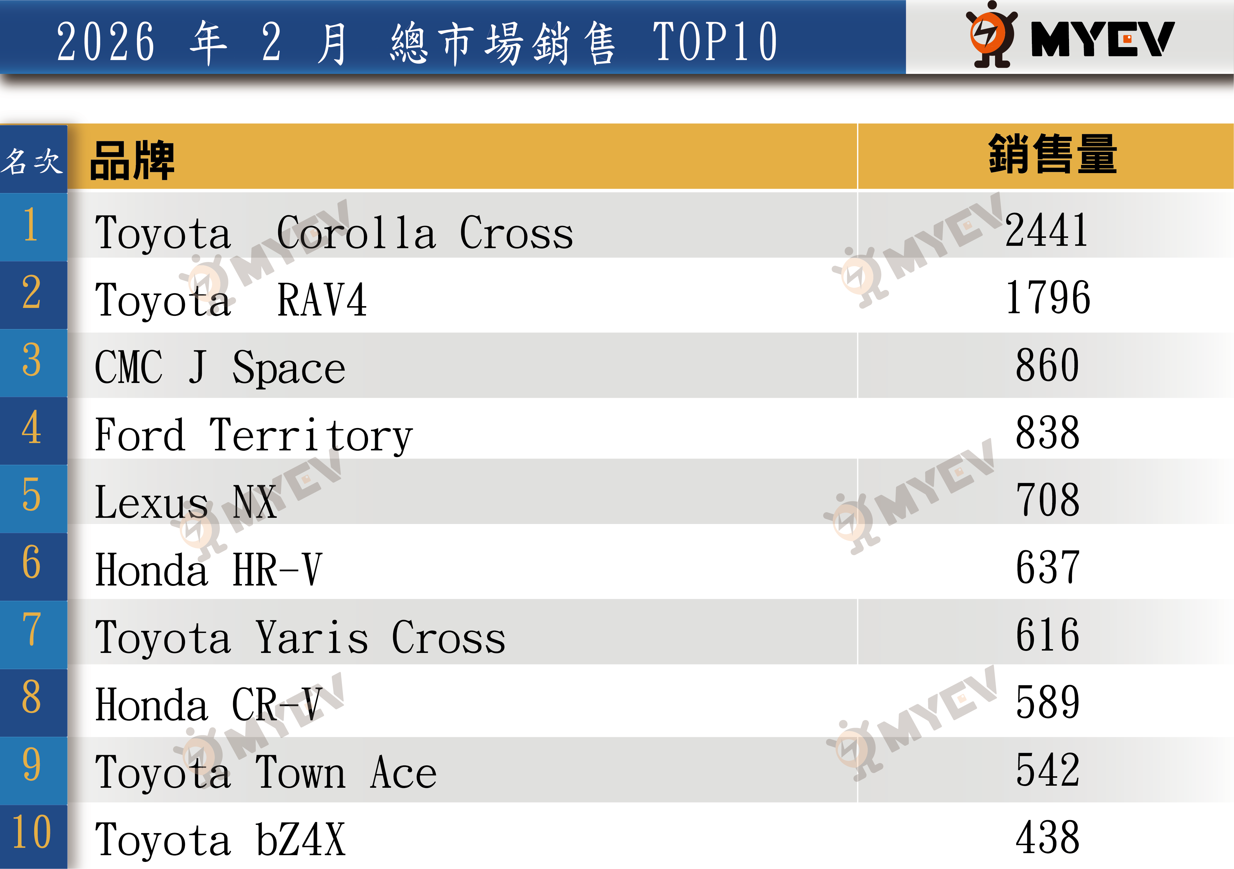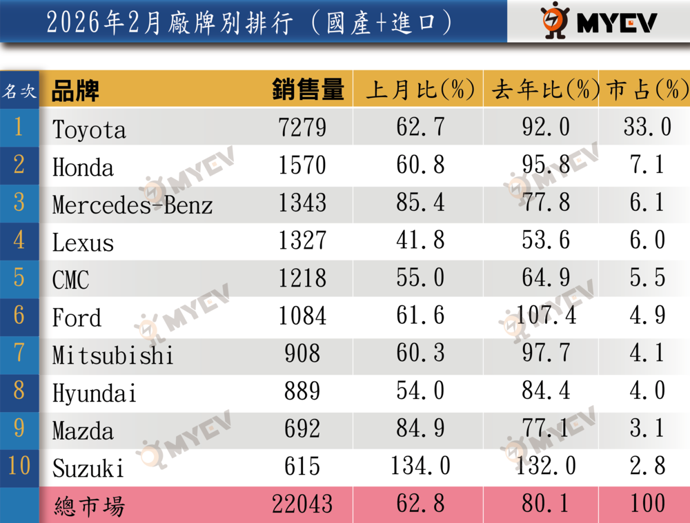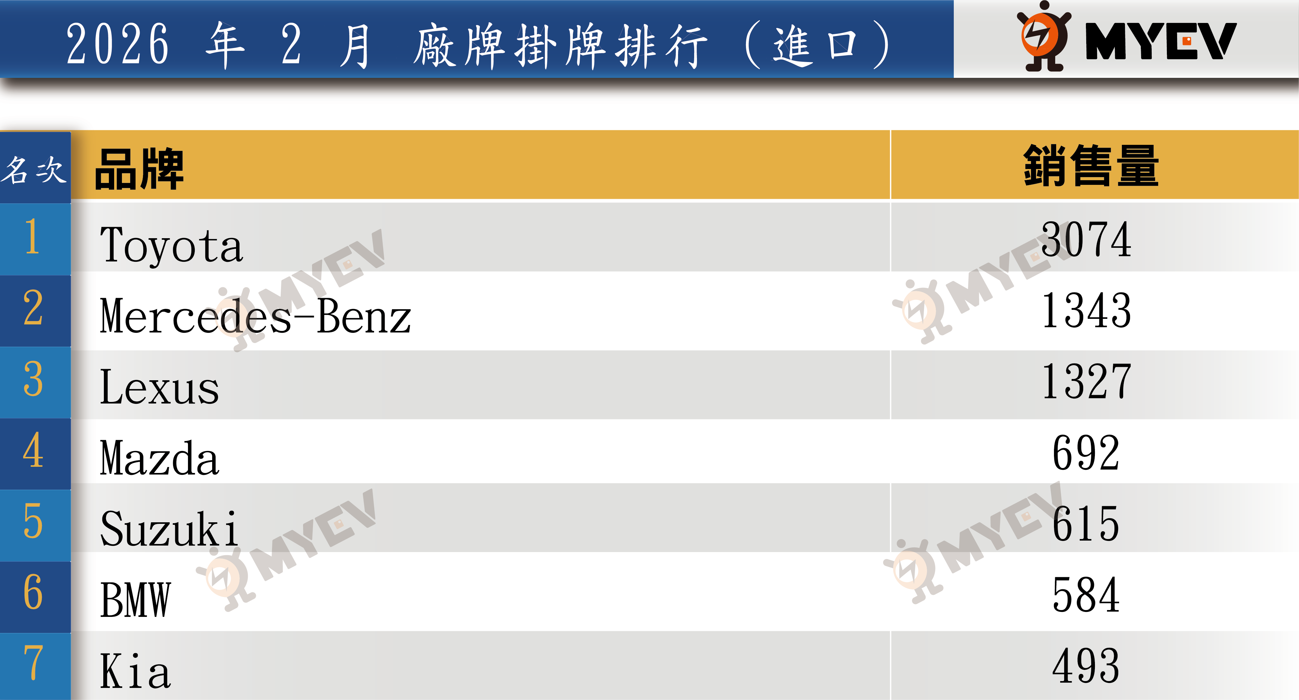 進口品牌方面,Mercedes-Benz單月掛牌1,343輛,較1月僅小幅下滑,排名推升至總市場第3名;Mazda則憑藉CX-5與CX-30穩定輸出,維持前段班位置。整體而言,除長期領先的Toyota外,第2至第6名品牌差距有限,顯示市場集中度持續提升。