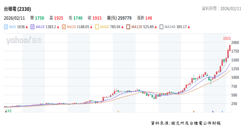 受惠人工智慧(AI)晶片需求爆發與先進製程領先優勢,台積電近一年股價持續創高,2026舊曆年封關價格已逼近2,000元大關。多數法人認為,在AI、高效能運算(HPC)與先進製程短期無人可以取代,且訂單需求的帶動下,台積電營收與毛利率仍有再創新高的條件,足以支撐股價中長期走勢。