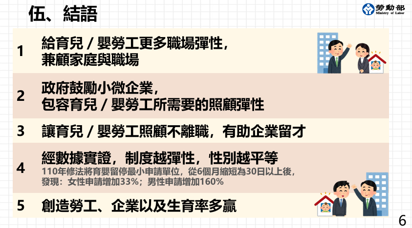 1. 友善企業獎勵支持:30人以下企業因人力有限,勞工請假可能增加成本,政府提供每日育嬰留停補助雇主1,000元,並設「工作生活平衡獎」肯定企業友善措施。