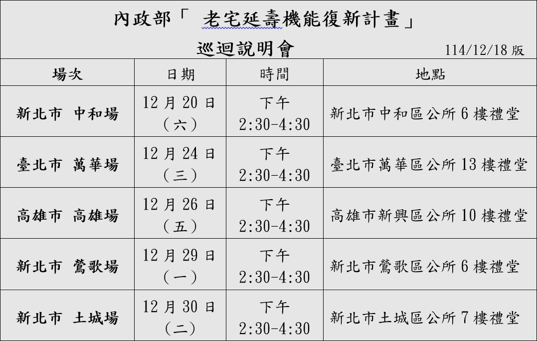 內政部表示,首波老宅延壽政策宣導活動已自11月底展開,優先前往人口稠密及老屋集中地區與居民面對面說明,目前已巡迴新北市三重區、臺北市大同區與松山區,以及嘉義市,後續將於12月20日新北市中和區、12月29日鶯歌區及12月30日土城區接續辦理,鼓勵社區與住戶在116年12月31日前踴躍提出申請。