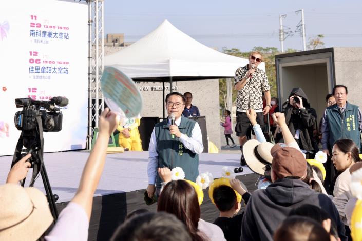 台南市「2026台南好young」耶誕跨年系列活動今(29)日正式開跑。首場親子活動「南科童樂太空站」於南科考古館舉行,吸引大批民眾到場,主辦單位估計現場人數逾6千人次。活動中,香蕉先生的功夫大球秀、馬戲藝術家JAMA的多元雜耍,以及各種趣味互動表演,成功營造歡樂氛圍,吸引大人小孩一同參與。市長黃偉哲親自到場發放小熊氣球,與市民共享愉快假日時光,市議員陳碧玉亦出席共襄盛舉。