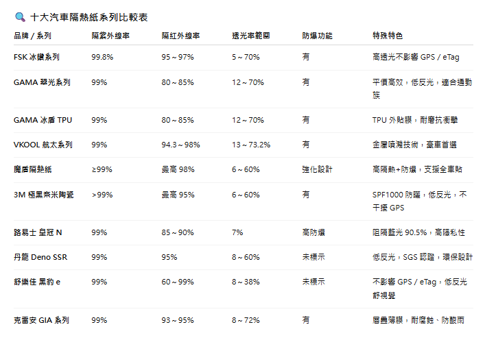 綜合市場上主流的汽車隔熱紙觀察,FSK、GAMA(含翠光與冰盾 TPU 系列)、3M、路易士與魔盾,各自擁有獨特的技術優勢與明確的使用族群定位。從隔熱效能、紫外線阻隔率、透光性到防爆能力,五大品牌皆展現亮眼表現,但消費者仍需依據個人需求與預算精準選擇,才能發揮最佳使用效益。