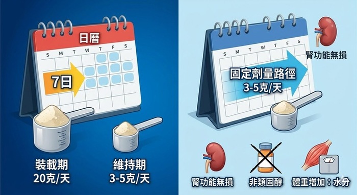 目前研究最常見且安全的補充劑量為每天3至5克。補充方式主要有兩種。一種是每天固定補充3至5克,約4週即可讓肌肉儲量達到飽和;另一種是所謂的裝載期,即前5至7天每天約20克(分4次補充),之後每天3至5克維持。裝載期可以更快達到肌肉飽和,但腸胃不適的機率較高。