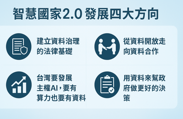 面對全球AI競爭,臺灣政府已提前啟動「智慧國家2.0」計畫,以資料治理為核心,提出四大行動策略。第一,建立法律基礎與監管制度,包括成立個資保護委員會、修訂個資法及推動AI基本法,以保障人民隱私並促進創新應用。第二,從資料開放走向資料合作,與產業及公民團體共同運用公開資料解決交通、醫療及環境問題。第三,發展主權AI必須兼顧算力與在地資料,政府積極建立繁體中文與臺灣語境的AI訓練資料庫,提供高品質資料強化AI運算與決策能力。第四,善用資料輔助政府決策,例如整合水利與災害風險資料,提升治水、防洪及地方治理效率。