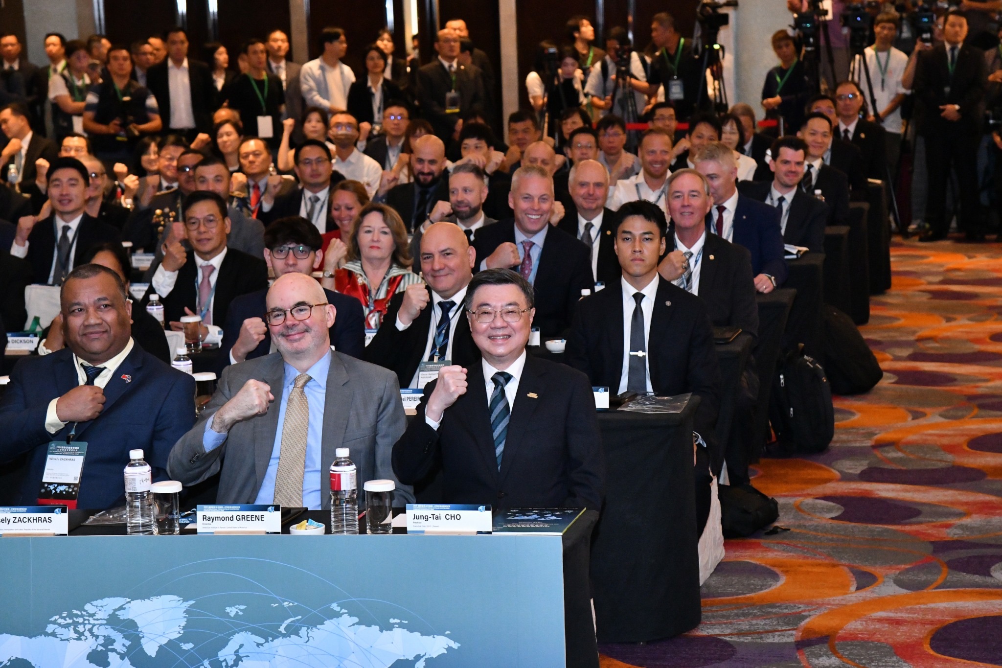 致詞結束後,卓院長與內政部劉世芳部長、外交部葛葆萱次長、農業部黃昭欽次長、內政部警政署張榮興署長、美國在台協會(AIT)谷立言(Raymond Greene)處長、帛琉共和國國務部艾古斯(Gustav N. Aitaro)部長、馬紹爾群島共和國司法、移民暨勞工部查克拉(Wisely Zackhras)部長、國際警察首長協會(IACP)Ken Walker會長等貴賓共同參與啟動儀式,為研討會揭開序幕,象徵臺灣深化國際警政合作的新里程碑。