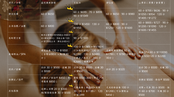 ● 頂級全餐 $1350:全身按摩 60 分 + 腳底按摩 60 分