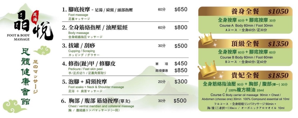 ● 養身全餐 $1050:全身按摩 60 分 + 腳底按摩 30 分