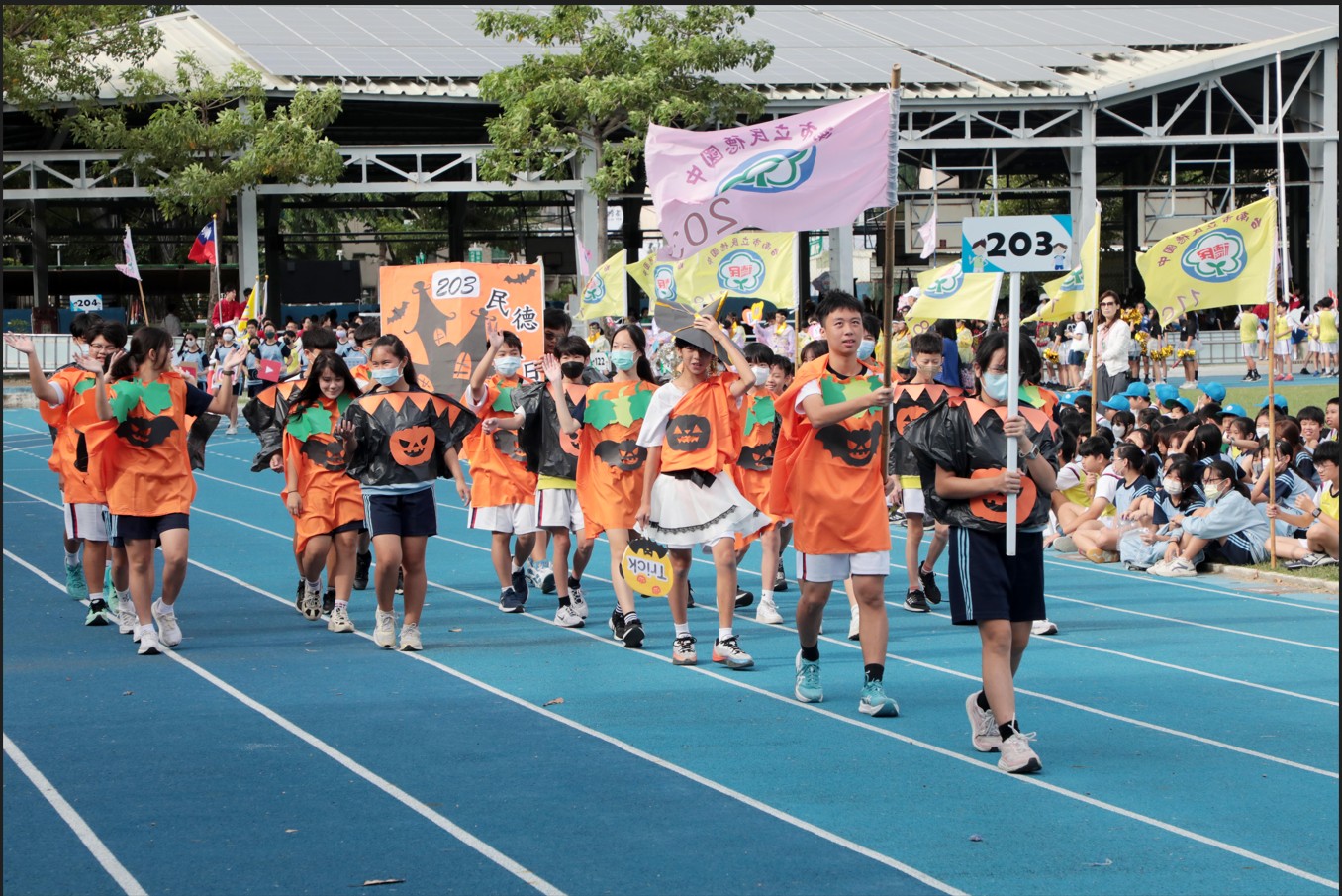(民德國中57周年校慶運動會開幕典禮,各班級變裝入場展現創意。)