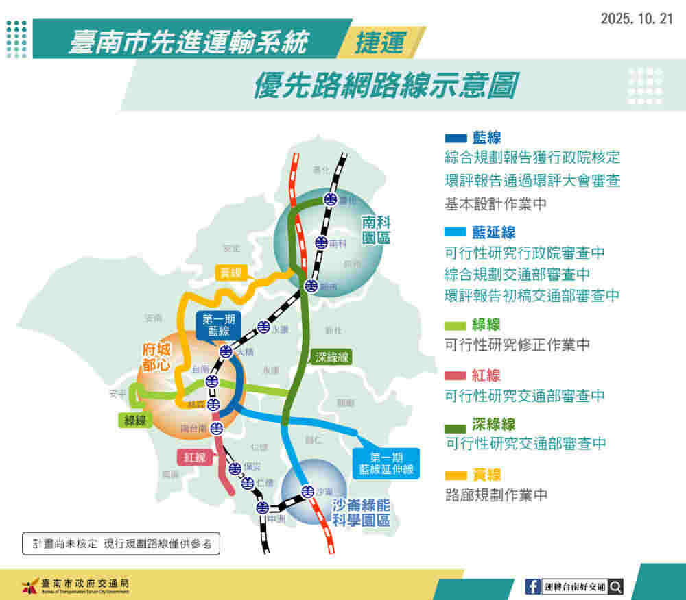 王銘德說,依據目前行政院核定的捷運藍線綜合規劃報告,總建設經費327.31億元,中央補助193.59億元、台南市府自籌133.72億元。市府已超前部署, 後續統包工程、專案管理等標案也都準備好,將陸續辦理發包作業,力拼115年底前實質動工,工期約六年。