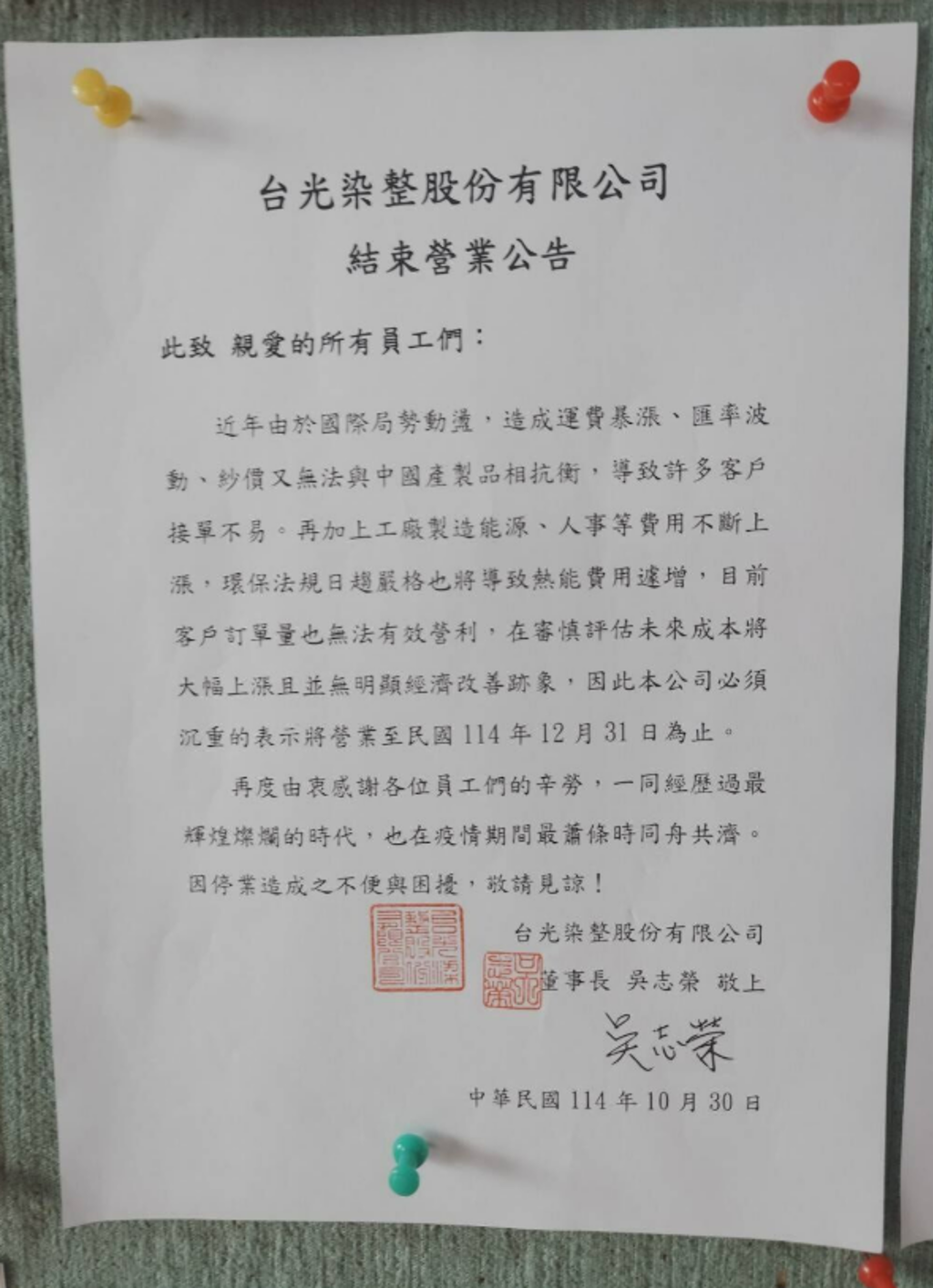桃園市蘆竹區經營逾半世紀的老字號印染企業——台光染整股份有限公司,近日公告將於今年(114年)12月31日結束營業。該公司成立51年,是當地重要傳統產業之一,因國際局勢、成本飆漲與法規壓力等多重因素,最終選擇黯然退場,為傳產轉型困境再添一例。