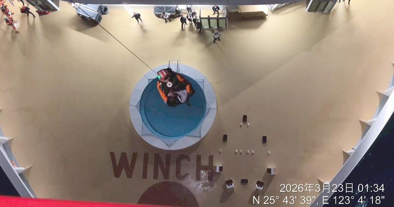 今日凌晨0059時抵達現場後,機組人員先進行高低空偵察,評估風向、風速、海況及船上環境安全,隨後精準完成吊掛作業,將病患以擔架安全吊掛進艙,並以吊環將陪同家屬一併吊掛上機,於機上持續監測生命徵象。0237時安全降落松山機場,隨即由地面救護人員接手轉送至馬偕醫院接受進一步急救與治療。