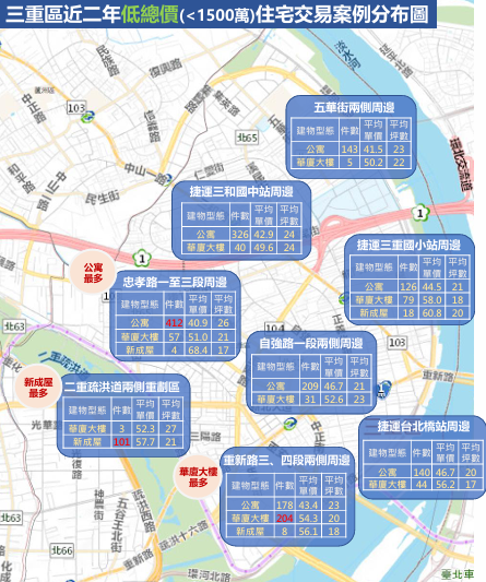 在地交易資料顯示,三重舊市區生活機能完善,成為低總價公寓交易重鎮。其中「忠孝路一至三段兩側」交易達412件、「捷運三和國中站」周邊326件,平均單價每坪約41至43萬元,坪數多落在24至26坪。