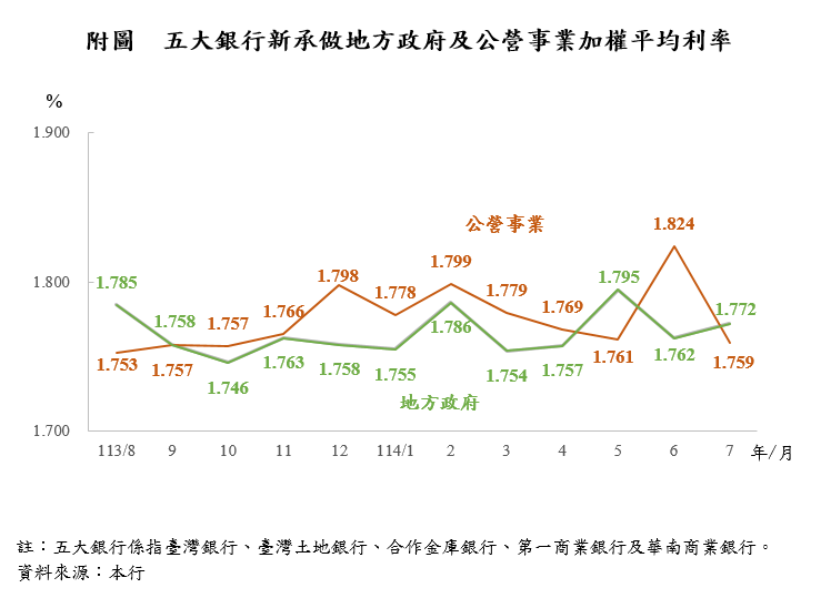 央行指出,自上(113)年8月請銀行自主管理不動產貸款總量以來,五大銀行新承做地方政府及公營事業放款的加權平均利率並無明顯下降,且放款增加幅度明顯低於個人及民營企業。統計顯示,地方政府放款利率介於1.746%至1.795%,波動僅0.049個百分點;公營事業放款利率介於1.753%至1.824%,波動僅0.071個百分點。整體高低差距有限,並無媒體所稱「利率直線下降」現象。