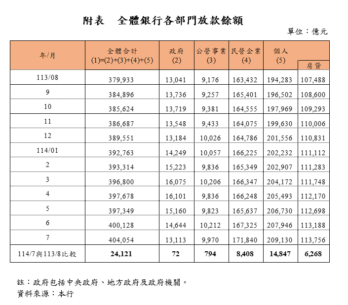 在放款餘額方面,截至本(114)年7月底,全體銀行放款較上年8月底增加2.4兆元,其中個人放款增加1.5兆元(房貸增加6,268億元)、民營企業增加8,408億元;公營事業及政府放款分別僅增加794億元及72億元。數據顯示,銀行承作個人與民營企業貸款幅度遠高於地方政府及公營事業,並無「肥政府、瘦民眾」現象。