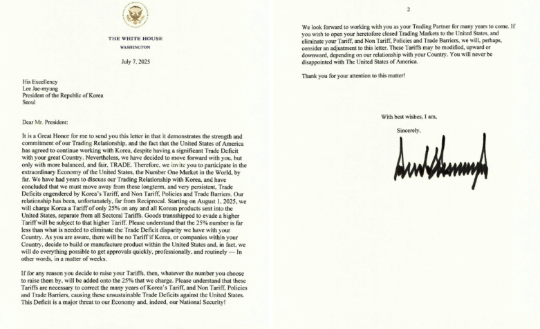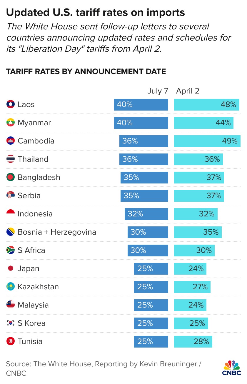 依據信函內容,對自日本、南韓、馬來西亞、哈薩克與突尼西亞等國進口商品,美方將自8月起課徵25%關稅;南非與波士尼亞為30%;印尼32%;孟加拉與塞爾維亞則為35%;柬埔寨與泰國36%;寮國與緬甸稅率更高達40%。川普在信中強調,關稅稅率「可根據雙邊關係調整」,但警告若有國家祭出報復性關稅,「美方將加倍回應」。