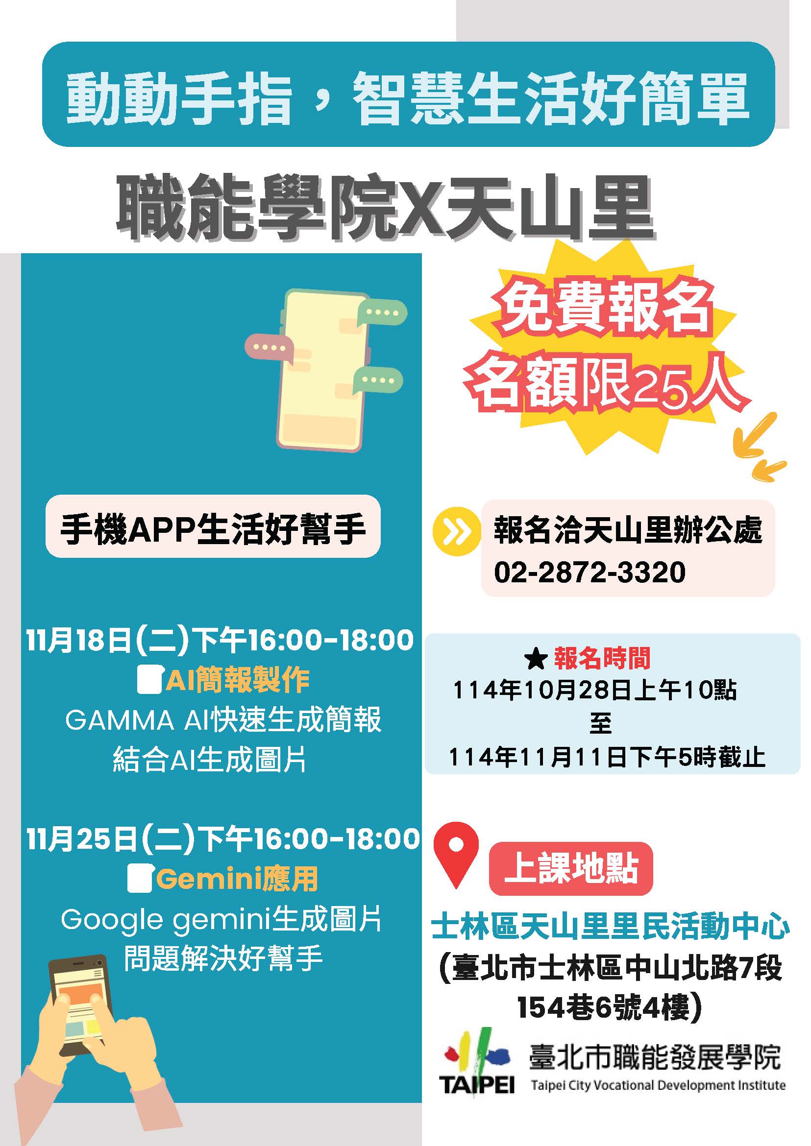 課程預計於聖山里與天山里開辦,結合實用與創意兩大主軸。其中,聖山里開設「手機魔法入門課」與「攝影魔術師」,引導學員從修圖、拍照到製作生活問候圖,實踐手機應用的樂趣;天山里則以「AI簡報製作」與「Gemini應用」為核心,讓民眾體驗生成式AI如何協助設計旅遊簡報與內容創作,展現智慧科技在日常中的多元應用。