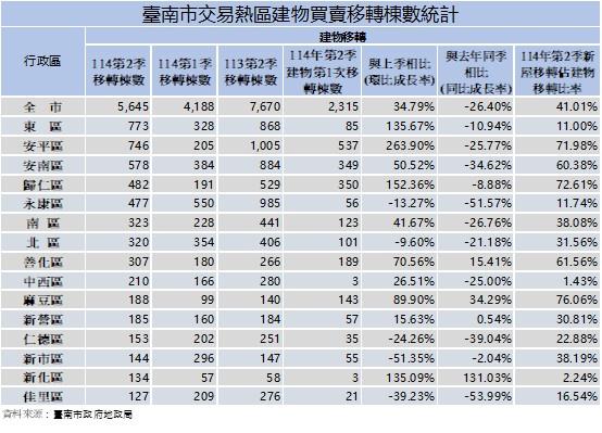 臺南市政府地政局今(10)日公布114年第2季不動產買賣移轉統計資料,顯示交易量在歷經數季調整後出現回溫跡象。土地買賣移轉筆數達10,208筆,較第1季增加6.71%,雖較去年同期下滑29.93%;建物買賣移轉棟數為5,645棟,季增幅達34.79%,但仍較去年同期減少26.40%。其中,新成屋市場明顯活絡,建物辦竣第一次登記後移轉棟數達2,315棟,占建物總移轉比率41.01%,季增幅高達68.12%,顯示交屋潮帶動交易熱度升溫。