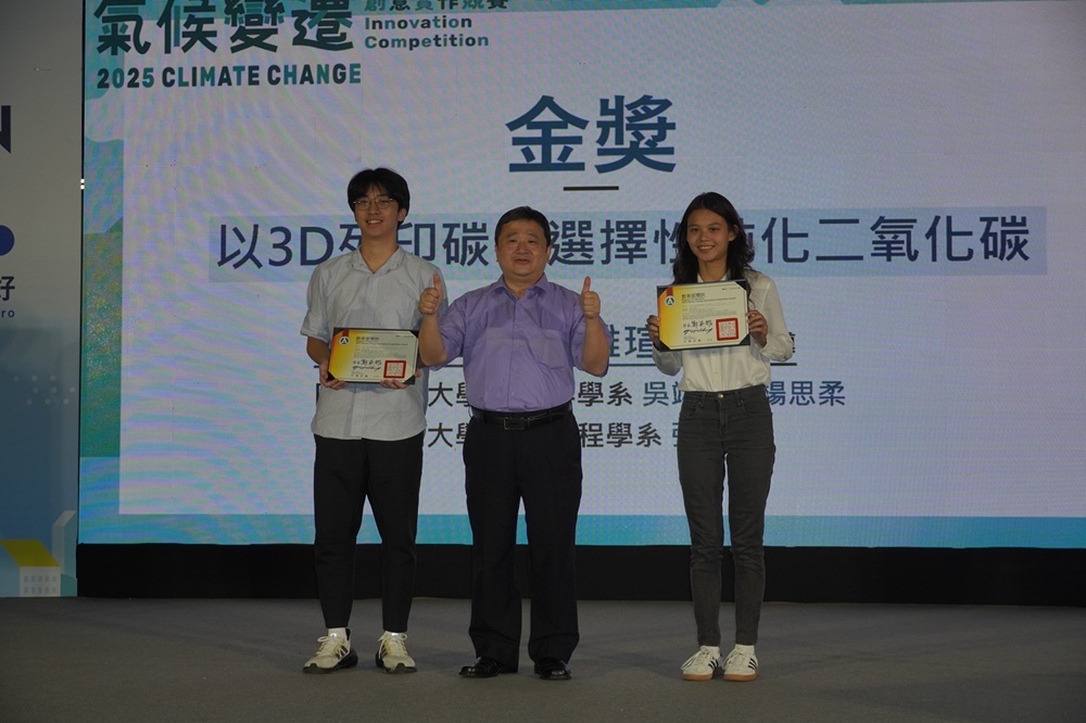 大專校院組「氣候變遷創意實作競賽」金獎由國立臺灣大學及宜蘭大學團隊奪得,他們利用3D列印碳材技術,成功捕捉二氧化碳以供再利用或封存。銀獎則由國立臺灣大學與清華大學團隊的「GreenBike:騎出永續未來」作品,以及國立中興大學團隊的「鋁渣高值化、產品化方法」作品獲得,兩組作品皆以創新方式解決環境永續及資源回收問題。