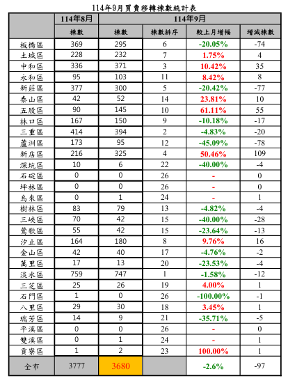 新北市政府地政局最新統計指出,114年9月全市房市交易移轉棟數共計3,680棟,較8月減少97棟,減幅約2.6%,顯示第三季末房市交易略有降溫。