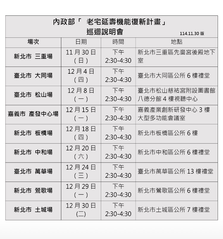 內政部今(30)日在新北市三重區先嗇宮舉辦首場「老宅延壽機能復新計畫」巡迴說明會,內政部長劉世芳出席活動,強調政府將透過專業輔導及簡便程序,協助屋齡30年以上住宅進行修繕與優化,提升居住安全,打造符合高齡者生活需求的「銀髮友善宅」。