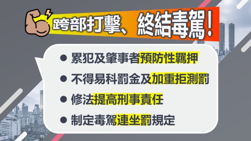 在前端執法持續強化之際,政府亦同步推動後端法制改革,提升整體嚇阻效果。內政部已啟動跨部會合作機制,攜手法務部、交通部及高檢署等相關單位,研議更具強度的法律對策。相關修法方向包括,將毒駕累犯及肇事者納入《刑事訴訟法》預防性羈押條件、加重拒絕檢測罰責與採驗強度、提高刑事責任並限制易科罰金,以及研議同車乘客連帶責任等措施,期望透過制度與執法雙軌並進,全面壓制毒駕行為。