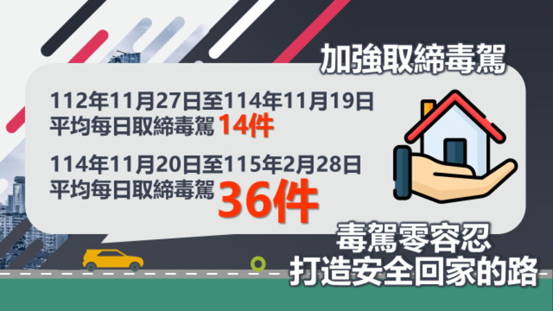 為強化道路交通安全、遏止毒品駕駛危害,政府持續推動「毒駕零容忍」政策,自114年11月20日全面啟動毒品唾液快篩執法以來,已展現具體成效。根據統計,截至115年2月止,全國警察機關共查獲3,230件毒駕案件,不僅凸顯政府打擊毒駕犯罪的決心,也有效降低潛在交通風險,守護民眾生命財產安全。