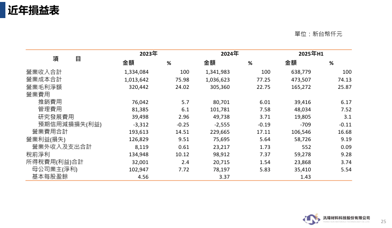 根據財報數據,汎瑋材料 2025 年上半年合併營收 63.88 億元,年增逾 20%,毛利率 25.87%、營業利益率 9.19%,分別較去年同期提升 2.87 與 3.32 個百分點。稅後淨利 3.54 億元,EPS 達 4.56 元,優於市場預期,反映產品組合持續優化與高毛利應用的拉動。此外,膠帶及隔熱紙佔其營業額達30%。