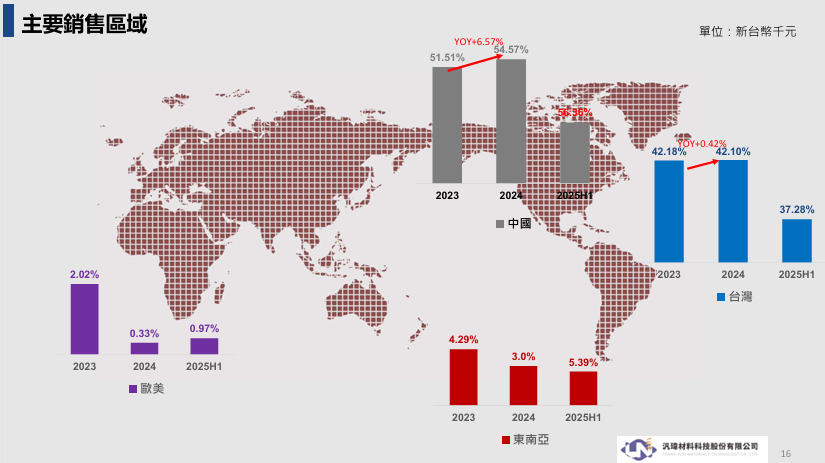 汎瑋材料目前於 臺灣、昆山、重慶、越南及馬來西亞均設有據點,逐步建構跨國供應鏈。2025 年上半年,中國市場仍為最大來源,占比 56.36%,臺灣 37.28%,東南亞 5.39%,明顯高於去年的 3%。