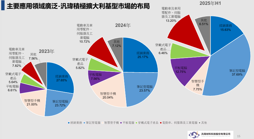 汎瑋材料過去以消費性電子應用為主,但 2025 年上半年結構已有顯著轉型。經銷業務比重由 2024 年的 27.65% 降至 15.63%,反觀高毛利應用快速攀升: