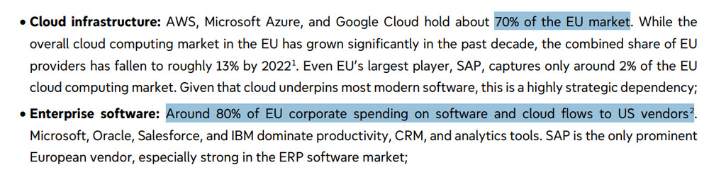 根據路透社與彭博社等外媒報導,歐洲長期高度依賴美國科技企業的雲端與軟體服務。歐洲議會近期發布報告指出,美國三大雲端服務供應商Amazon Web Services、Microsoft Azure與Google Cloud合計占據歐洲約7成雲端市場。報告並指出,歐洲企業在軟體與雲端服務的支出中,超過8成最終流向美國公司,此種高度集中結構,使歐盟在地緣政治與法律風險上面臨挑戰。