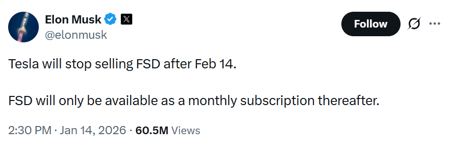 美國電動車大廠特斯拉近日正式調整其「全自動駕駛」(Full Self-Driving,FSD)商業模式。執行長伊隆·馬斯克(Elon Musk)透過X平台發文確認,自2026年2月14日起,特斯拉將停止以一次性付費方式銷售FSD,全面改採月度訂閱制,定價為每月99美元或每年999美元。此前,車主可選擇以8,000美元一次性買斷,或改以月費方式訂閱使用。此一調整不僅象徵FSD商業模式的關鍵轉折,也被市場解讀為與馬斯克個人薪酬目標,以及特斯拉未來軟體營收布局高度連動。