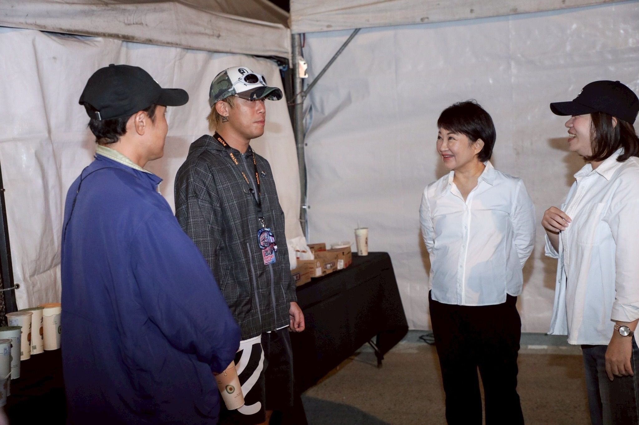 盧市長抵達現場後與玖壹壹三位成員握手致意,感謝他們連續兩年選擇臺中舉辦大型音樂祭,提升中央公園的城市辨識度。她也分享中央公園周邊重大建設進度,包括綠美圖、臺中國際會展中心與臺中巨蛋,並指出綠美圖試營運後成為熱門拍照景點。